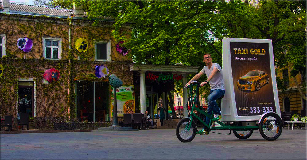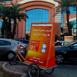 Vélo Publicitaire est un support écologique tractant votre publicité, Ces vélos sont 100% écologiques, 0% CO2, Vélo Publicitaire comprend deux panneaux de 120x180cm et communique sur une surface de 6m², Ce qui vous donne un maximum de visibilité à votre Marque. Vélo Publicitaire vous permet d’aller à la rencontre de votre public de façon originale et vous donne la possibilité de profiter d'un bouche à oreille positif (Buzz), de booster vos ventes, de fidéliser votre clientèle existante et de développer votre notoriété, votre message touche des milliers de consommateurs (600 vues/h), et permet de communiquer là ou les autres médias ne peuvent aller pour un coût inférieur aux autres médias. Le dynamisme et le sourire de nos animateurs ainsi que le coté innovant, original et éco-responsable des supports sauront marquer les consommateurs, clé du succès de votre campagne de communication.